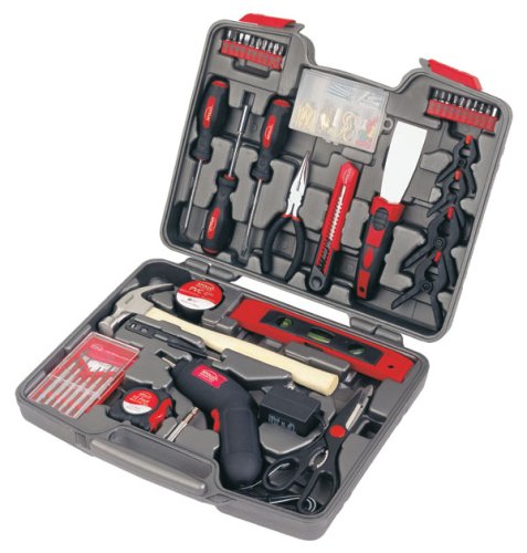 This great set of household tools is perfect for all your home projects. Includes: 4.8 volt rechargeable cordless screwdriver • 12' tape measure • 13 oz claw hammer • 6" long nose pliers • Putty knife • Bit driver • 10 - 1" CRV screwdriver bits: 1/8", 5/32", 3/16", 1/4", PH1, PH2, PH3, PZ1, PZ2, PZ3 • 10 - 1" CRV screwdriver bits: T10, T15, T20, T25, T27, T30, 1/8" 5/32", 3/16", 1/4" • 2" bit connector • 18mm utility knife • Phillips 4" x #2 screwdriver • Slotted 4" x 1/4" screwdriver • Six precision screwdrivers: Phillips #0 and #1, Slotted 1.4mm, 2mm, 2.4mm, 3mm • 9" level • 8" scissors • Two 2.5" spring clamps • Two 3.5" spring clamps • Digital voltage tester • PVC electrical tape "